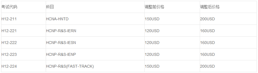 華為職業(yè)認證考試券價格將于2015年7月1日在全球范圍內進行調整,此次調整共涉及到五門考試,詳細內容參見下表:
