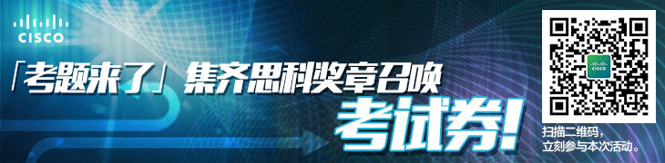 即日起至2015年9月30日關(guān)注思科認(rèn)證微信,參與"考題來了"集齊思科獎(jiǎng)?wù)抡賳究荚嚾顒?dòng),即有機(jī)會(huì)贏取價(jià)值1,888美元的思科CCNA路由和交換 200-120 CCNA考試券或思科CCNA路由和交換官方在線學(xué)習(xí)課程,思科助你順利通過思科認(rèn)證考試。