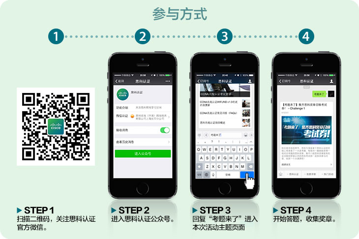 3.在完成Challenge 2考題后,總共收獲到八枚獎(jiǎng)?wù)碌男疫\(yùn)者即獲得召喚思科考試券的資格,將你得到的八枚思科獎(jiǎng)?wù)陆貓D(結(jié)合Challenge 1和Challenge 2所有獎(jiǎng)?wù)拢┌l(fā)送至思科認(rèn)證微信公眾平臺(tái),就有機(jī)會(huì)參與幸運(yùn)抽獎(jiǎng)。思科抽出5位思科免費(fèi)考試券及10位免費(fèi)課程幸運(yùn)兒,助你獲得思科認(rèn)證考試。