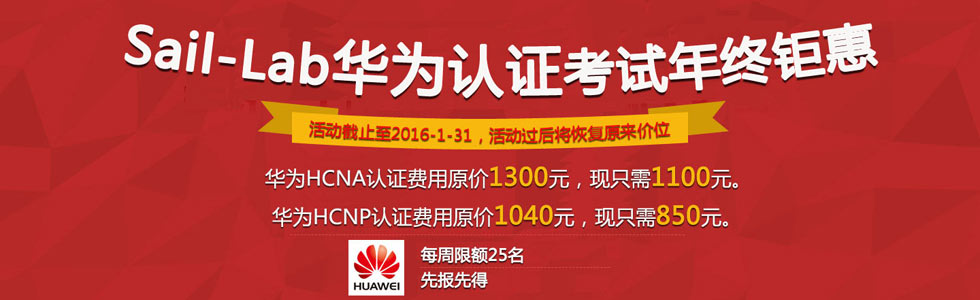 Sail-Lab網(wǎng)絡(luò)實驗室華為認證年終鉅惠 優(yōu)惠方向 HCNA方向:RS、security、cloud、storage,VC,UC HCNP方向:RS、security、cloud、storage 優(yōu)惠價格 華為HCNA系列認證,原價1300元/門,現(xiàn)只需1100元/門。 華為HCNP系列認證,原價1040元/門,現(xiàn)只需850元/門。 優(yōu)惠時間 優(yōu)惠活動截止日期:2016年1月30日00:00 考試注意事項 1、考試提前2天預(yù)約付費(如索取發(fā)票按照15%稅點收。 2、預(yù)約考試請?zhí)峁盒彰、姓名全拼、郵箱、電話、工作單位或?qū)W校 3、考試當(dāng)天請?zhí)崆鞍胄r到達考試中心攜帶雙證 4、考試當(dāng)天請攜帶雙證(第一證件:身份證,第二證件:學(xué)生證、護照、駕照、工作證等) 5、每周限額25人,先報先得 考場地址聯(lián)系人 考場地址:南寧市大學(xué)東路98號世貿(mào)西城B座1501室 聯(lián)系考官:謝老師(0771-2796086、159-9443-7962) 官方主頁:www.jxxjxx.com